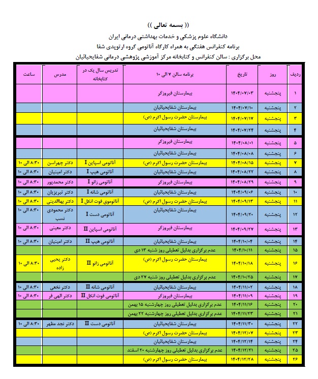 کارگاه آناتومی ارتاریخ 1404/8/15 لغایت 1404/11/11 هرپنجشنبه برای دستیاران سال یک گروه ارتوپدی درکتابخانه مرکز شفابرگزار میگردد.